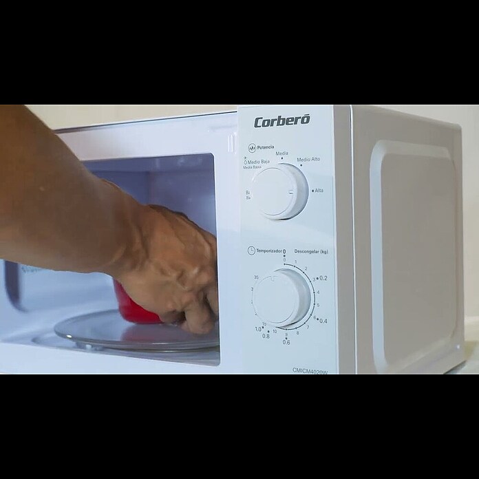 El microondas CMICM4020W de Corberó destaca por su acabado en color blanco y su instalación libre, lo que permite instalarlo en prácticamente cualquier cocina. Es un modelo muy fácil de usar gracias a sus mandos mecánicos y giratorios. Permite configurar hasta cinco niveles de potencia, además de la descongelación. También dispone de temporizador de 35 minutos. Incluye plato giratorio de 25,5 cm de diámetro.