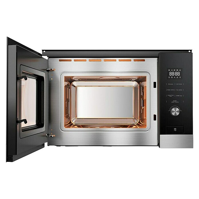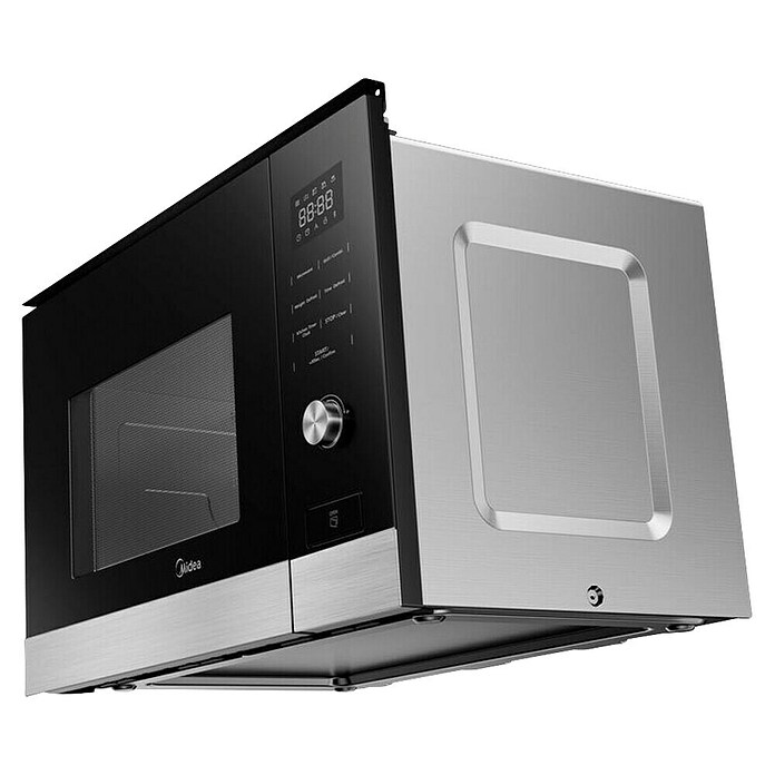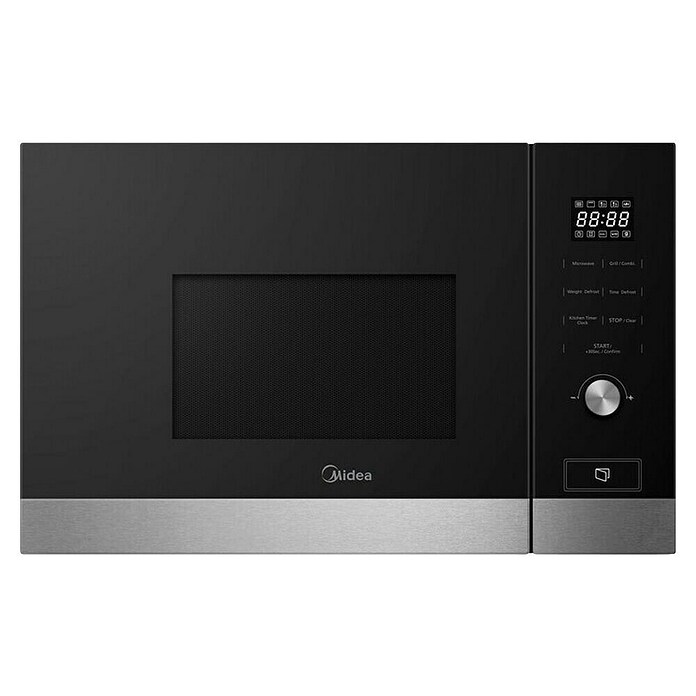 El microondas empotrado MBMTG820H-X de Midea combina elegancia y funcionalidad, ideal para cocinas modernas gracias a su diseño en cristal negro con perfil inox. Su capacidad de 20 litros lo hace perfecto para familias pequeñas y su integración en muebles altos o columnas optimiza el espacio en la cocina.