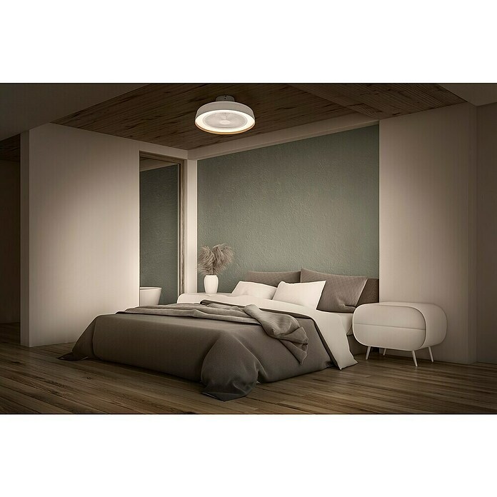 El ventilador de techo Ceiling Fan Compact de Osram ofrece una solución eficiente que combina iluminación LED regulable y ventilación para espacios interiores de 13 a 20 m². Su diseño moderno y compacto integra un flujo de aire máximo de 1900 m³/h con seis niveles de velocidad y modos verano/invierno, lo que permite optimizar el confort durante todo el año. Su luz LED ajustable de 2700 a 6500 K proporciona desde blanco cálido hasta blanco frío, ideal para adaptarse a diferentes ambientes, con un flujo luminoso total de 3000 lm y atenuación de 0 a 100%. Fabricado en polipropileno blanco, es ligero y duradero, con motor DC silencioso que favorece un uso agradable durante la fase de sueño. Incluye control remoto, temporizador de 2 y 4 horas y protección IP20. Su instalación superficial es sencilla, con accesorios completos y medidas compactas de 480 mm de diámetro y 215 mm de alto.