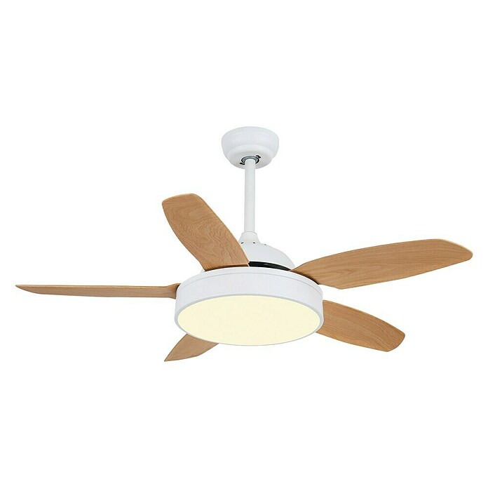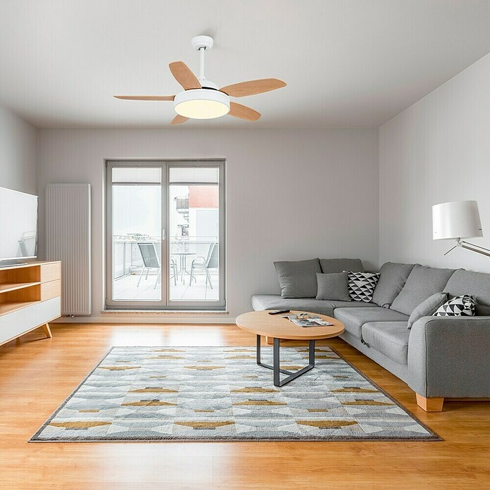 El ventilador de techo Mykonos de Arte Confort combina las formas de un diseño moderno con el toque natural de la madera de las aspas con un plafón de luz opaco en la base que añade carácter a cualquier estancia. Las aspas giran hacia ambos lados, la rotación a la izquierda refresca en verano y la rotación a la derecha hace bajar el aire caliente para el invierno. De fácil instalación, se controla mediante un mando a distancia que permite seleccionar entre 5 velocidades de rotación, control de luz y programación.